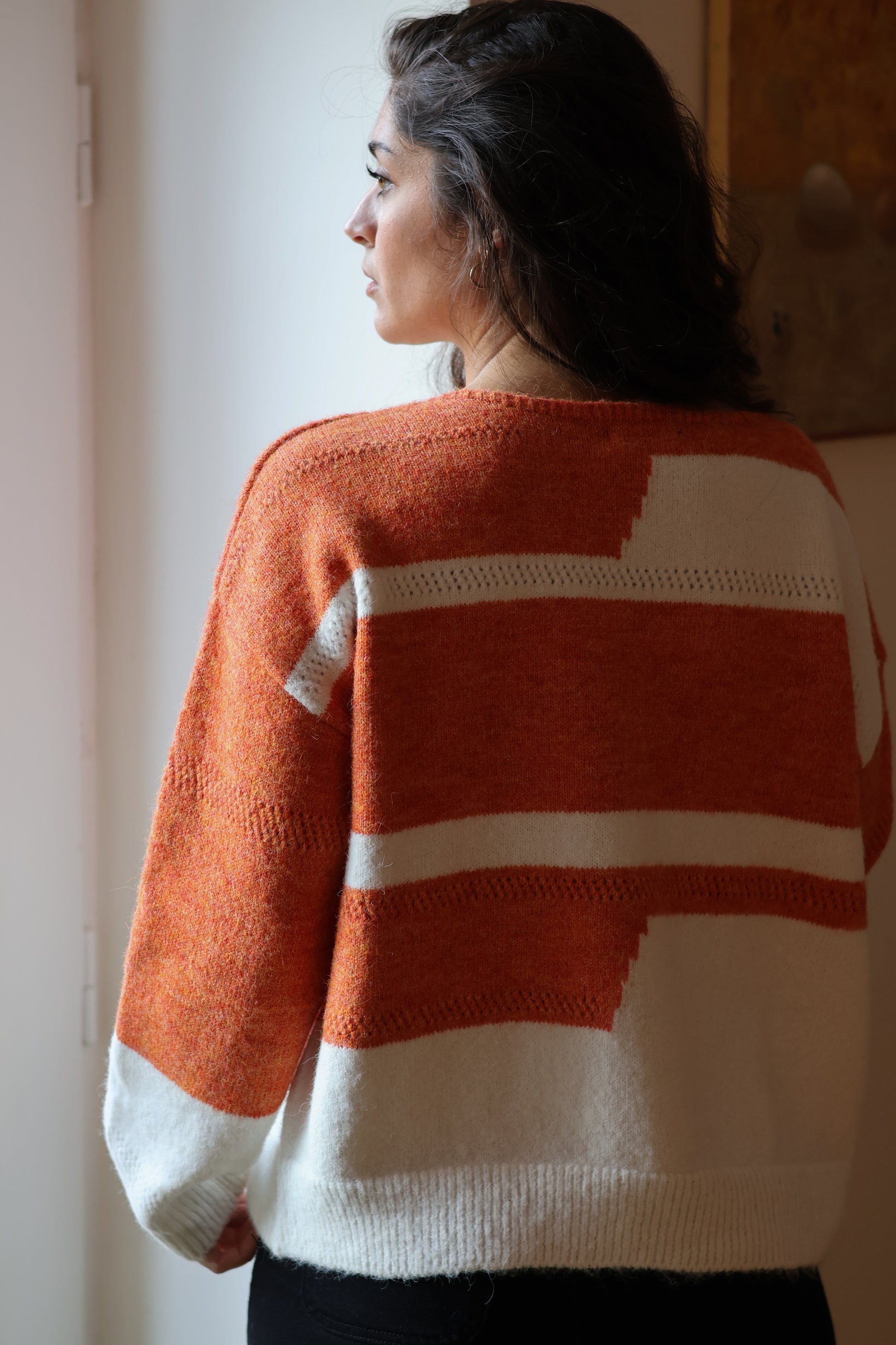 Le pull GEO orange est proposé en taille unique